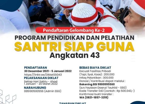 Santri Siap Guna adalah Program Pendidikan dan Pelatihan yang dilaksanakan setiap Sabtu – Ahad selama 12 pekan dengan pemberian wawasan dasar Islam yang disertai dengan pembentukan karakter BAKU (Baik dan Kuat). Karakter Baiknya yakni ikhlas, jujur dan tawadhu, sedangkan karakter Kuatnya yakni berani, disiplin dan juga tangguh yang nantinya akan terbentuk jiwa Pelopor, Mandiri & Ahli Khidmat.