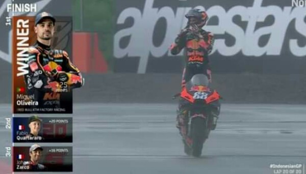 BANDUNGASIA.com : Miguel Oliveira mempersembahkan kemenangan bagi KTM setelah menaklukan lintasan basah Sirkuit Pertamina Mandalika, Lombok, NTB, berkat penampilan yang cukup dominan di Grand Prix of Indonesia, Ahad (20/3/2022).