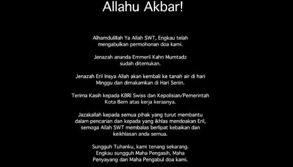 “Kami mohon doa dan dukungan agar seluruh proses kepulangan Ananda Eril ke Indonesia dapat berjalan dengan lancar,” ujar Muliaman.