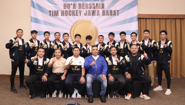Tim Hockey Jawa Barat bersama Ketua Umum FHI Jabar H. Syahrir, SE, M.IPol, dan tim official untuk laga PON XXI Sumut – Aceh 2024. BandungAsia.com / FHI Jabar